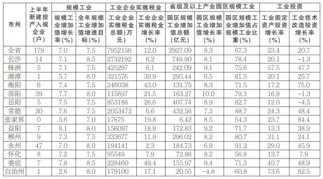 一、工业运行总体平稳。上半年,全省规模工业增加值同比增长7.0%,高于全国平均水平0.3个百分点。其中,规模工业增加值增速排前三位的益阳、娄底和邵阳,增速分别为8.1%、7.8%和7.7%。省级及以上产业园区规模工业增加值增长8.3%,增加值总量占全省规模工业的67.3%,比上年同期提高0.9个百分点。50个重点产业园区规模工业增加值全部实现增长。其中,湖南邵东经济开发区、长沙雨花经济开发区和望城经济技术开发区规模工业增加值增速最快,分别增长13.4%、12.7%和12.7%。
