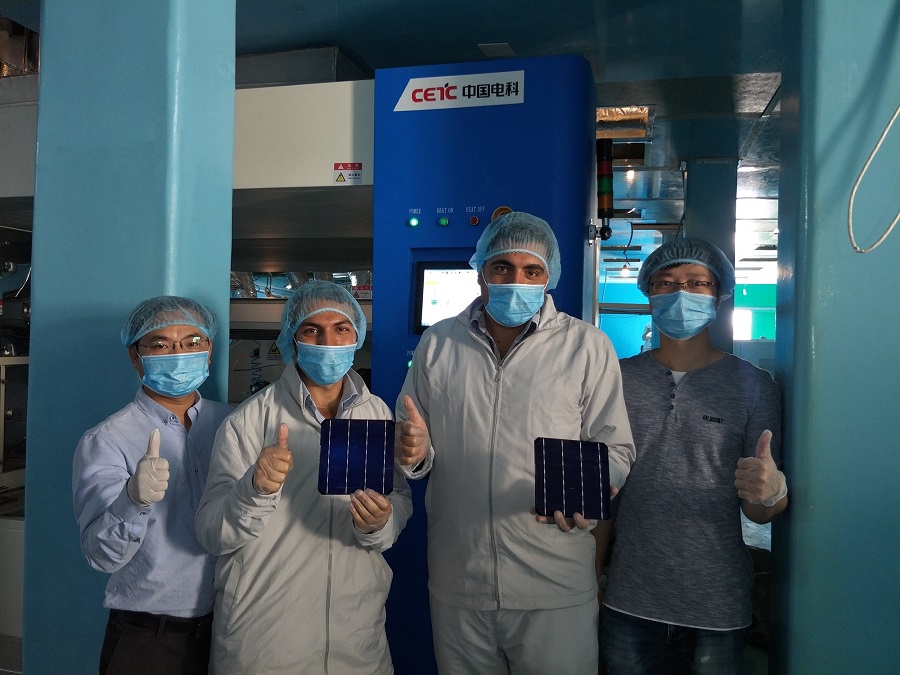 中国-埃及可再生能源国家联合实验室,科研人员展示在中国电科48所指导下、埃及自行生产的高端太阳能电池片。(资料图片) 通讯员 摄
