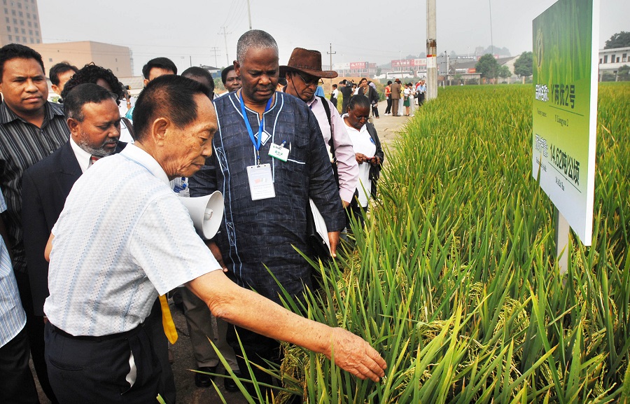 2009年9月12日,袁隆平院士在给参加杂交水稻技术对外合作部长级论坛的代表们介绍超级杂交水稻的生长情况。(资料图片)湖南日报记者 郭立亮 摄