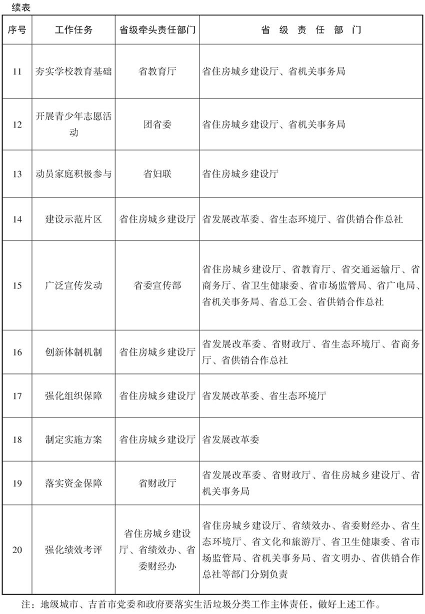 (一)强化组织保障。坚持高位推动,建立党委统一领导、党政齐抓共管、全社会共同参与的生活垃圾分类领导体制和工作机制。省直各相关部门按照职责分工协力推进,各城市人民政府要切实承担主体责任,建立协调机制,形成“以块为主、条块结合”的市、区、街道、社区四级“党政负责、部门联动”的生活垃圾分类工作体系。对于城市生活垃圾分类工作中涌现出的先进典型,按照有关规定给予表扬奖励。各地要结合实际,做好生活垃圾分类管理地方性法规、规章的立法、修订工作,依法依规通过教育、处罚、拒运和纳入社会诚信体系等方式进行约束,逐步提高生活垃圾分类准确率。