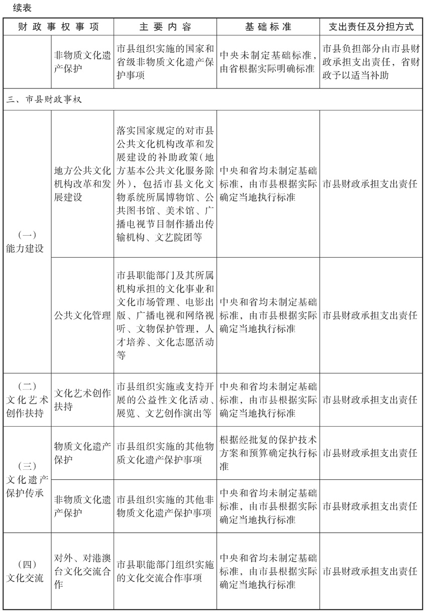2.公共文化管理。主要包括各级有关职能部门及所属机构承担的文化事业和文化市场、电影出版、广播电视和网络视听、文物保护管理,以及人才培养、文化志愿活动等。按照隶属关系,省级职能部门及所属机构承担的事项,确认为省级财政事权,由省级承担支出责任;市县职能部门及所属机构承担的事项,确认为市县财政事权,由市县承担支出责任。