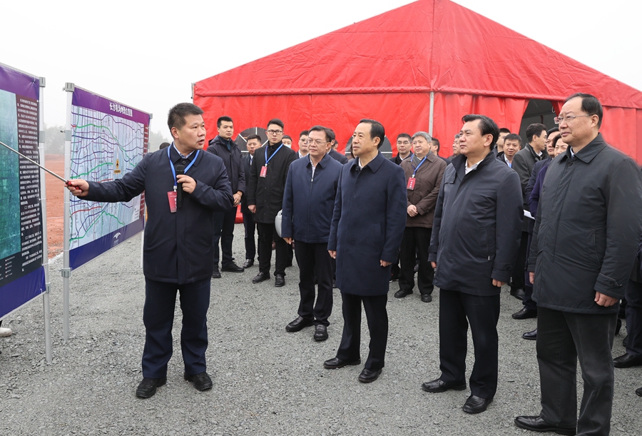 12月3日上午,长沙机场改扩建暨综合交通枢纽工程启动,省委书记许达哲宣布项目启动,中国民航局党组书记、局长冯正霖,省委副书记、代省长毛伟明在启动仪式上讲话。图为启动仪式前,许达哲等了解项目建设主要内容。