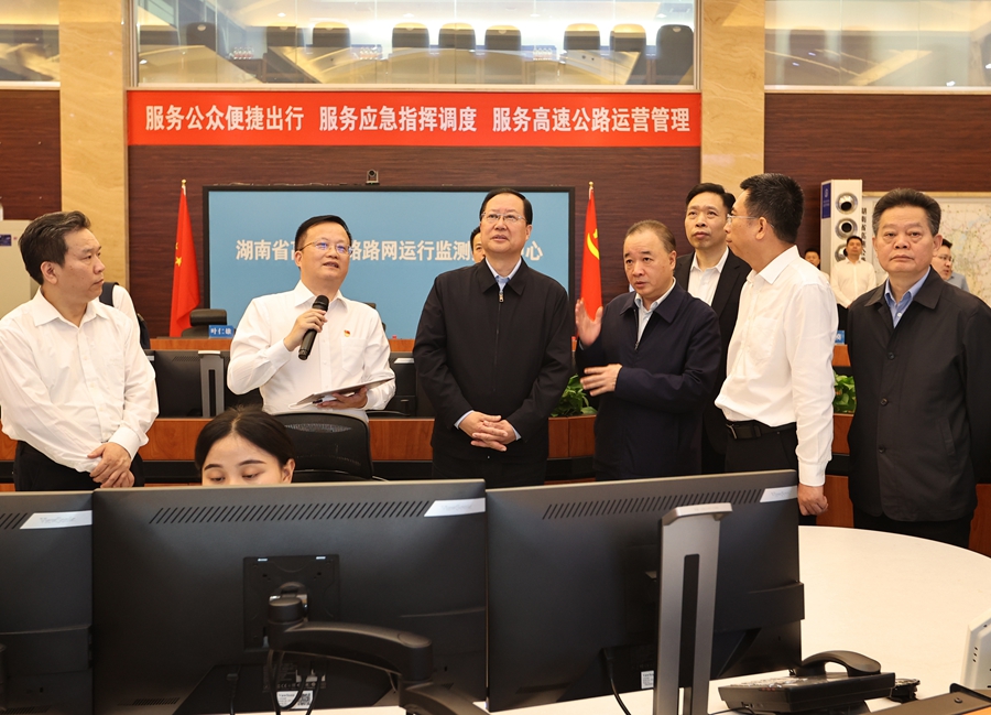 毛伟明一行首先来到省高速公路路网运行监测指挥中心。该中心通过建设智慧高速可视化系统,实现了“路网运行监测、应急指挥调度、通信传输监测、公众出行信息服务”等实时智能与深度融合,成为全省高速公路路网管理的“神经中枢”。“可视化系统实现高速路网的可视、可测、可控、可服务,为全省交通路网建设运营提供科学参考。”毛伟明强调,湖南高速公路集团要在实施“三高四新”战略中找准定位,在改革发展稳定中闯出新路,在安全生产经营上守住底线,坚持守正创新、开拓进取,争当交通强省建设先行者、勇担“三高四新”战略主力军。