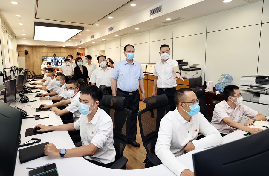 8月19日下午,省委副书记、省长毛伟明在省应急管理厅调研。图为毛伟明查看省应急管理指挥中心值班室值守情况。