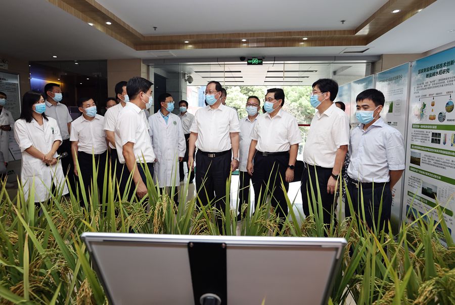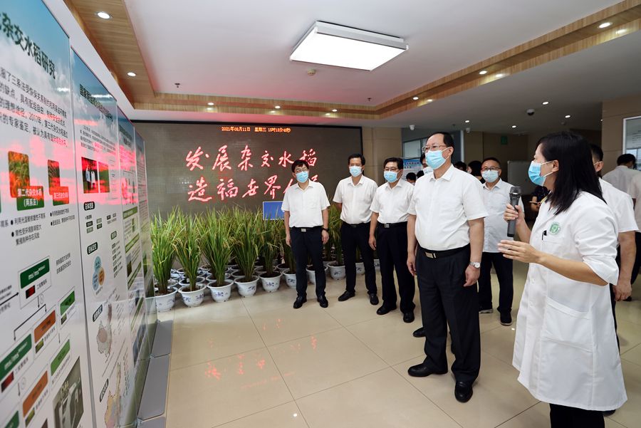 8月11日下午,省委副书记、省长毛伟明来到省农业科学院调研。图为毛伟明一行在省农科院杂交水稻国家重点实验室考察。