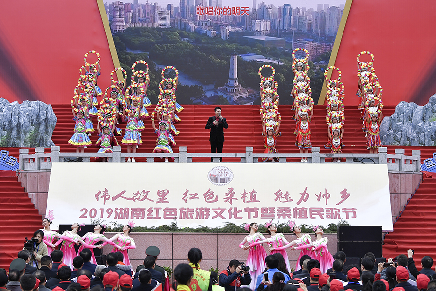 11月19日上午,演员在表演精彩的文艺节目。当天,2019湖南红色旅游文化节暨桑植民歌节在中国工农红军第二方面军长征出发地——桑植县刘家坪开幕。