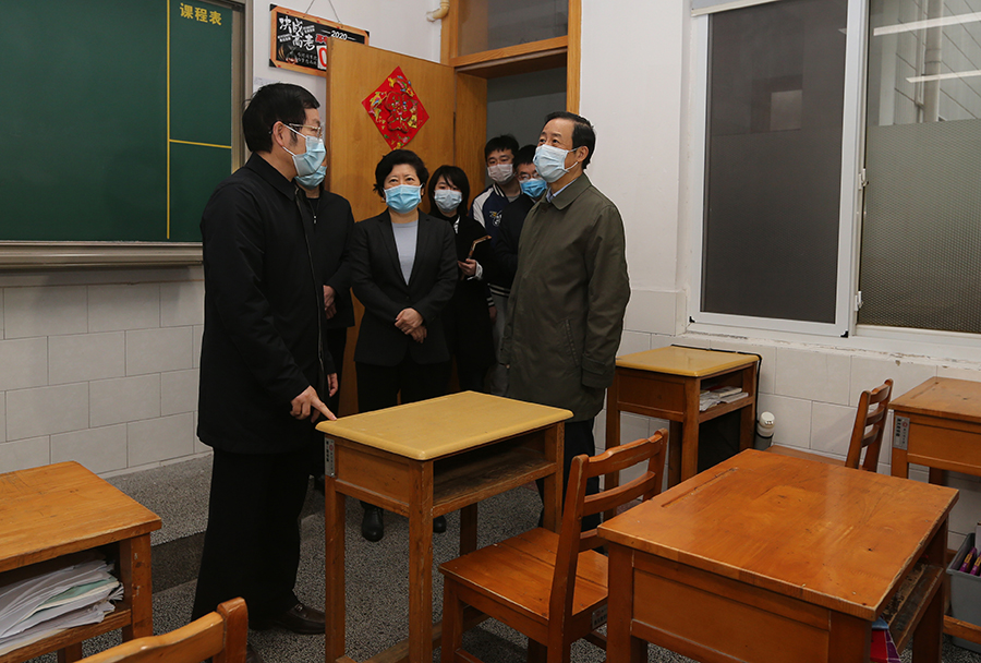 走进高三年级一间教室,许达哲查看课堂座位摆放间距、通风条件等,询问学校口罩等防疫物资准备情况。得知学校将在上课时要求全体师生佩戴口罩,并为教师准备了随身扩音器,许达哲说,要从细节入手,把校园的疫情防控做实、做细,把各项准备做得更充分一些。即将迎战高考的高三学子可能心理压力较大,要及时干预疏导、给予关怀。