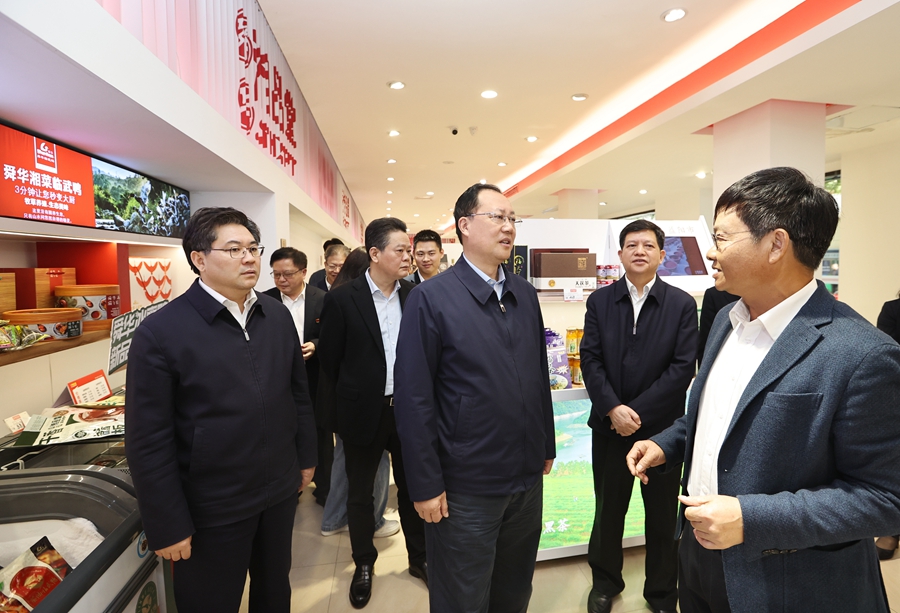 4月27日,省委副书记、省长毛伟明赴省农业农村厅调研并主持召开座谈会。图为毛伟明在湖南脱贫地区优质农产品展示展销中心调研。