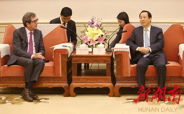 许达哲对客人的到访表示欢迎,并介绍了湖南经济社会发展情况。他说,在中法全面战略伙伴关系大背景下,湖南与法国合作市场广阔、潜力巨大。湖南是新兴工业大省,在工程机械、轨道交通、高铁动力控制、中小航空发动机等方面具有较强实力。当前,湖南正抢抓国家实施中部崛起战略重要机遇,大力实施创新引领开放崛起战略,努力推动高质量发展,着力建设经济强省、科教强省、文化强省、生态强省、开放强省。法国是最发达的工业国家之一,是世界文化艺术中心、世界第一大旅游接待国,有许多先进经验值得湖南学习借鉴。希望以大使先生此次访湘为契机,推动双方交流合作向更深层次迈进,在贸易投资、生态环保、科技创新、文化旅游、友城合作等领域结出更丰硕的成果。