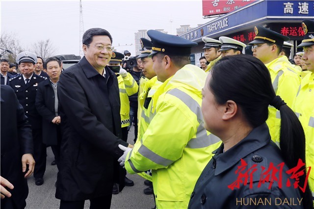正值节前春运高峰,京港澳高速公路已是车轮滚滚,长沙火车南站日均客流量逼近10万人次。杜家毫先后来到京港澳高速雨花收费站和长沙火车南站,看望慰问值班执勤的公安民警、武警官兵、交通运输部门工作人员,以及高铁、地铁、磁浮工作人员和志愿者,实地检查春运交通运输组织和安保工作。杜家毫说,新春佳节万家团圆之际,就是大家任务最繁重之时。让人民群众平平安安、顺顺利利回家过年,始终是我们第一位的责任。希望大家再接再厉,做好春运期间各项工作,充分运用信息化手段,加强值班调度,做好预报预警,强化安全应急管理,为广大群众营造更加安全、便捷、舒适的出行环境。