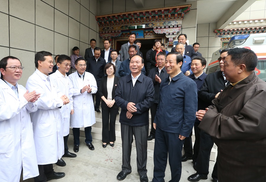 来到山南市藏医医院,代表团一行走进住院楼、门诊楼,考察了眼科、口腔科、配剂室等,了解湖南“组团式”医疗。许达哲同援藏医生们一一握手,他说,希望大家在为当地培养打造一批高水平医疗人才方面继续下功夫,为藏族同胞的身体健康和湘藏两地卫生事业交流合作作出新的贡献。