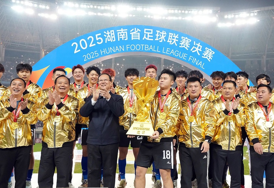 12月27日晚,2025湖南省足球联赛(简称“湘超联赛”)在长沙贺龙体育场上演巅峰对决。经过90分钟的鏖战,最终永州队以1∶0战胜常德队,夺得2025湘超联赛冠军。全国政协副主席、民革中央常务副主席何报翔到场观赛,省委副书记、省长毛伟明为冠军球队颁奖。