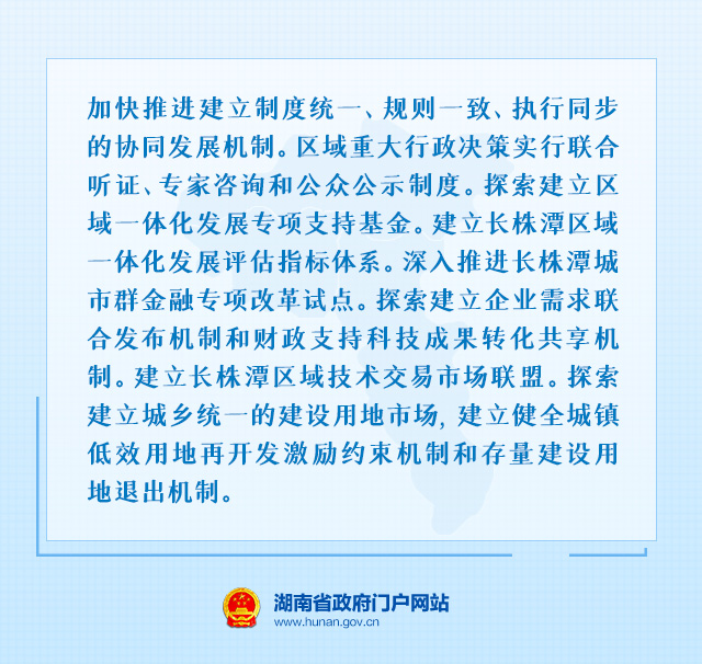 七是创新一体化发展体制机制。着力破除制约一体化发展的行政壁垒和体制机制障碍,建立运行有效的合作体系,加快建设统一开放大市场,为长株潭更高质量一体化发展提供强大内生动力。