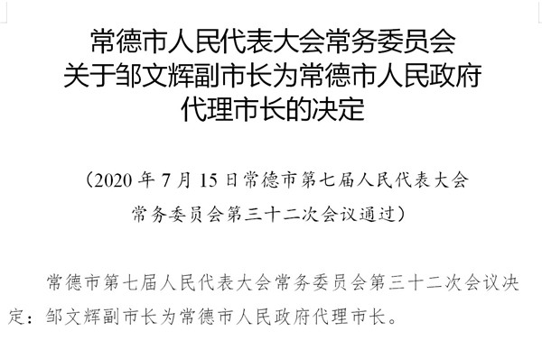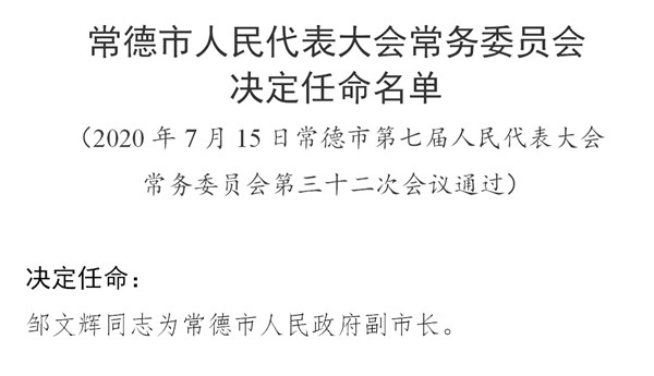 邹文辉任常德市人民政府副市长、代理市长