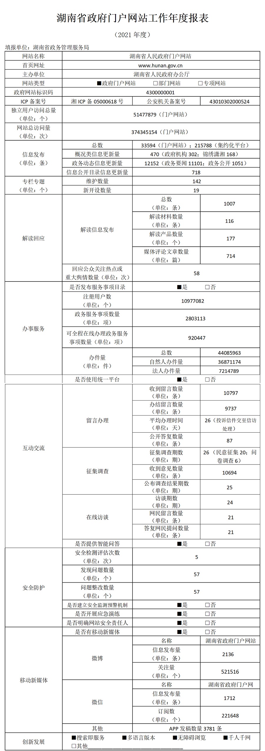 2021年湖南省政府门户网站工作年度报表