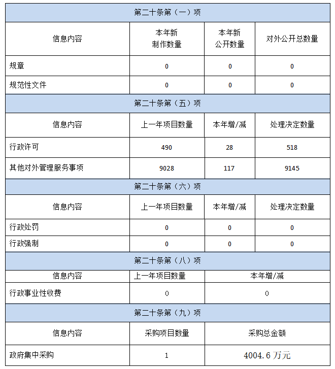 2019年度,湖南省新闻出版局、湖南省版权局、湖南省电影局共受理行政许可事项518件,办理对外管理服务事项9145件,全部按时办结。开展政府集中采购1项,即2019年农家书屋补充图书项目,采购金额总计4004.6万元。无行政事业性收费,未进行行政处罚和行政强制,未收到自然人、法人或其它组织提交的政府信息公开申请,无行政复议和行政诉讼。