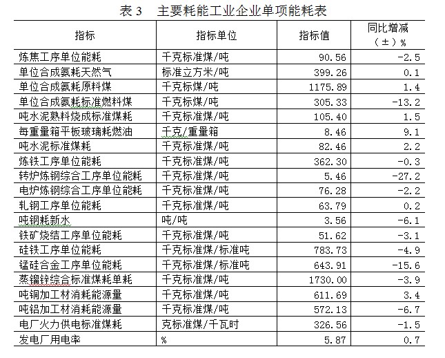 从单项单位产品能耗指标来看,12项主要产品的单耗水平同比下降,且部分产品单耗降幅明显。其中,转炉炼钢综合工序单位能耗下降27.2%,锰硅合金工序单位能耗下降15.6%,单位合成氨耗标准燃料煤下降13.2%,吨铝加工材消耗能源量下降6.7%,吨钢耗新水下降6.1%。