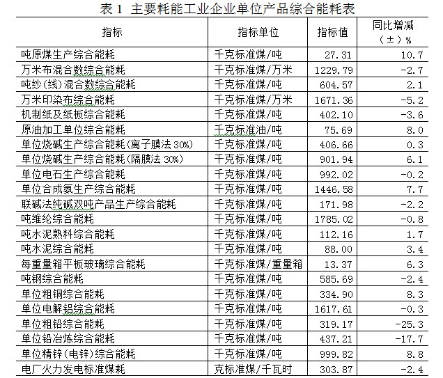 纳入统计监测的22种产品综合能耗中,11种呈不同程度的下降。其中,单位粗铅综合能耗、单位铅冶炼综合能耗、万米印染布综合能耗下降幅度居前三位,分别下降25.3%、17.7%和5.2%。