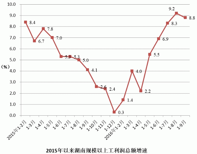 1-9月,湖南规模以上工业企业累计实现主营业务收入25551.35亿元,同比增长8.6%;盈亏相抵后实现利润总额1059.76亿元,增长8.8%,居全国第14位。每百元主营业务收入中的成本为84.45元,同比下降0.11元,主营业务收入利润率为4.15%。