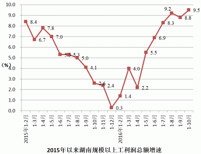 1-10月,湖南规模以上工业企业累计实现主营业务收入29094.54亿元,同比增长8.0%;盈亏相抵后实现利润总额1207.83亿元,增长9.5%,比全国平均增速高0.9个百分点,居全国第15位。每百元主营业务收入中的成本为84.59元,同比下降0.13元,主营业务收入利润率为4.15%。