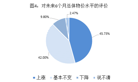 对于未来6个月总体物价水平,预期“上涨”、“基本不变”和“下降”的占比分别为45.73%、42.00%和9.80%。其中,城镇消费者预期物价“上涨”的比例高出农村1.5个百分点。(见图4)