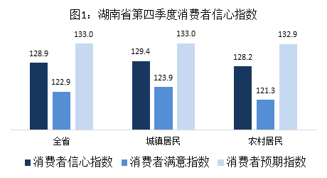 2020年12月份,湖南省统计局民意调查中心对全省3000名城乡居民进行了随机抽样调查。调查显示,我省第四季度消费者信心指数 为128.9,环比(与第三季度比,下同)回落2.6点,仍处于“比较乐观”状态。其中,消费者满意指数为122.9;消费者预期指数为133.0。分城乡看,城镇和农村消费者信心指数分别为129.4和128.2,其中,城镇消费者满意指数和预期指数分别为123.9和133.0,农村消费者满意指数和预期指数分别为121.3和132.9。(见图1)2020年,面对新冠肺炎疫情冲击和经济下行压力加大的影响,全省各季度消费者信心指数维持在117-131点,保持高位运行,呈现出平稳向好的发展态势,显示出在过去的一年中,湖南消费者对未来保持积极、乐观。