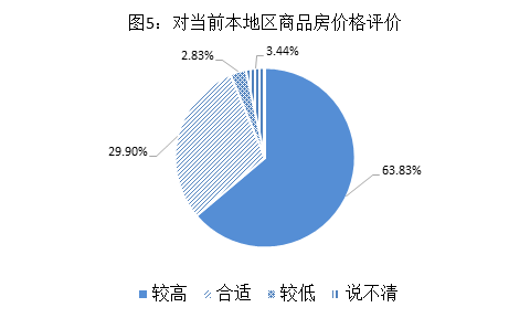 对于当前本地区商品房价格,63.83%的消费者认为“较高”,29.90%认为“合适”,2.83%认为“较低”。其中,农村消费者认为“较高”的比例高出城镇6.0个百分点。(见图5)