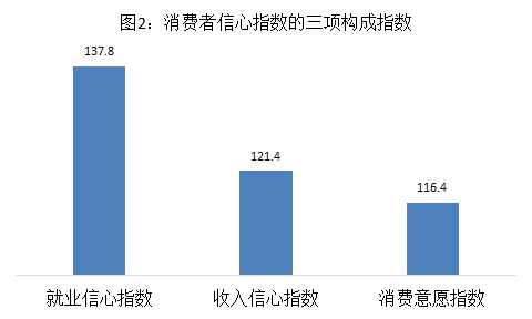 从消费者信心指数的三项构成指数来看,四季度就业信心指数为137.8,收入信心指数为121.4,消费意愿指数为116.4。(见图2)