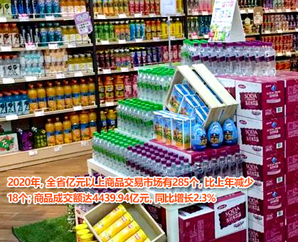 2020年,全省亿元以上商品交易市场有285个,比上年减少18个;商品成交额达4439.94亿元,同比增长2.3%;市场营业面积1155.46万平方米,增长4.2%;市场总摊位数20.12万个,减少2.6%;年末出租摊位数16.36万个,减少3.7%。按经营方式分,批发和零售市场分别为143个和142个,商品成交额分别为3442.29亿元和997.64亿元;按经营环境分,露天式、封闭式和其他方式的市场分别为24个、219个和42个,商品成交额分别为662.55亿元、3138.87亿元、638.52亿元。