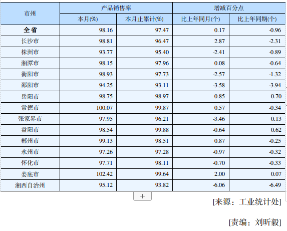 2022年湖南省分市州规模工业产品销售率(1-8月)