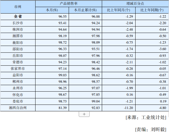 2022年湖南省分市州规模工业产品销售率(1-11月)