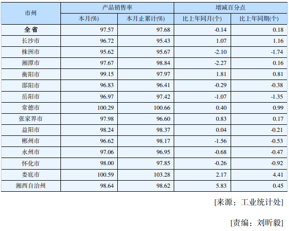 2023年湖南省分市州规模工业产品销售率(1-5月)