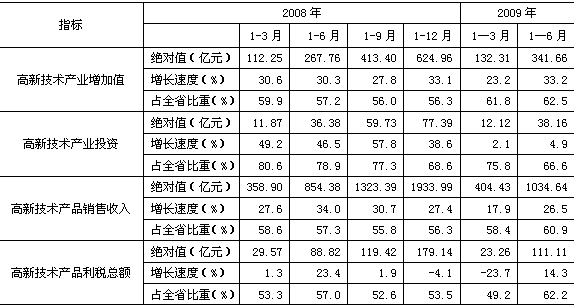 (4)高新技术产业发展迅速。2008年,长株潭城市群高新技术产业蓬勃发展。全年实现高新技术产业增加值、高新技术产业投资、高新技术产品销售收入和高新技术产品利税总额分别为624.96亿元、77.39亿元、1933.99亿元和179.14亿元,分别增长33.1%、38.6%、27.4%和-4.1%,占全省比重分别为56.3%、68.6%、56.3%和53.5%。2009年上半年,长株潭城市群分别实现高新技术产业增加值、高新技术产业投资、高新技术产品销售收入和高新技术产品利税总额341.66亿元、38.16亿元、1034.64亿元和111.11亿元,占全省比重分别为62.5%、66.6%、60.9%和62.2%;与2008年比较,尽管高新技术产业投资占全省比重回落2个百分点,但高新技术产业增加值、高新技术产品销售收入和高新技术产品利税总额占全省比重分别提高6.2个、4.6个和8.7个百分点,高新技术产业整体呈现平稳快速发展态势。