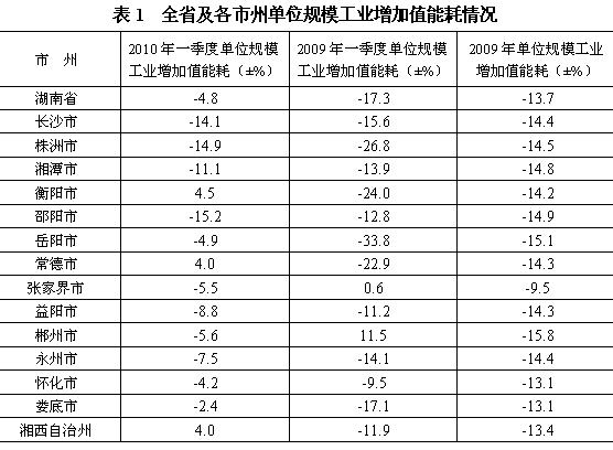 (五)单位工业增加值能耗降幅大幅收窄。一季度,全省单位工业增加值能耗下降4.8%,比2009年一季度收窄12.5个百分点。14个市州降幅低于全省降幅的有9个市州,高于全省降幅的有5个市州(见表1)。