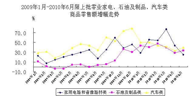 (三)热点商品零售同比增幅有回落的迹象。随着汽车生产的加快,供应及库存的增加,国家鼓励汽车消费的政策弱化,如购置税减免缩小,用车的成本增加,包括停车费和油价上涨等都直接影响了居民的购车热情,汽车类商品零售额增幅从1-2月的50.4%、3月份的43.5%、4月份的41.5%,5月份的33%,回落到6月份的39.3%;石油及制品类零售额增幅从1-2月的42.0%、3月份的47.7%、4月份的39.4%、5月份的28.6%,回落到6月份的33.5%;家用电器类商品零售额增幅从2月份的56%、3月份的53.9%、4月份的77.3%,5月份的43.5%,回落到6月份的24.8%。