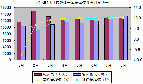 1-8月,从总体上看,我省交通运输客运量呈平稳发展,货运量呈逐月走高态势,客货运量累计增速均呈现逐月渐强的趋势。全社会累计完成客运量102947.21万人,货运量91037.97万吨,同比分别增长10.3%和11.4%,分别比上半年加快0.2和1.6个百分点。