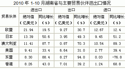 1-10月,湖南对澳大利亚进出口11.41亿美元,增长87.7%,其中出口0.87亿美元,增长70.3%;对香港进出口8.30亿美元,增长88.4%,其中出口8.27亿美元,增长94.0%,对日本进出口13.39亿美元,增长50.6%,其中出口3.95亿美元,增长49.3%。