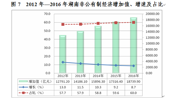 (四)新业态方兴未艾。从市场主体看,非公有制经济占据“大半壁江山”的新业态已然形成,且方兴未艾。2016年,湖南非公有制经济实现增加值18739.90亿元,是2012年的1.5倍,年平均增长10.5%,高于全省平均增长速度,发展势头向好;占全省地区生产总值的比重达60.0%,比2012年提高2.3个百分点(见图7)。从发展模式看,以“互联网+”、“城市综合体”等方式的新业态发展壮大。全省2016年电子商务交易额达6076.60亿元,是2012年601.62亿元的10.1倍,年均增速高达78.3% 。