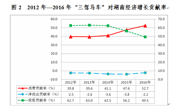 (一)新动能逐步凝聚。五年来,在扩大内需、刺激消费一系列相关政策的综合作用下,湖南经济增长由主要依靠投资拉动,逐步向消费与投资共同拉动转变,消费逐步凝聚成助推全省经济发展的新动能。2016年,消费对经济增长的贡献率达52.7%,比2012年的39.8%提高了12.9个百分点,五年中首次超过投资对经济增长的贡献率(见图2)。
