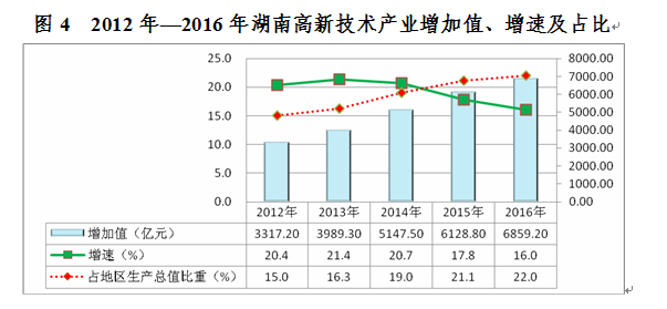 (二)新产业蓬勃发展。十八大以来,在省委、省政府一系列加快培育发展战略性新兴产业的方针政策下,湖南战略性新兴产业、高新技术产业等新产业蓬勃发展。一是战略性新兴产业平稳较快发展。2016年,全省战略性新兴产业增加值达3499.24亿元,是2012年的1.5倍,占地区生产总值的比重为11.2%,比2012年的10.3%提高了0.9个百分点。2013年至2016年,年均增长11.4%,比全省经济增长平均水平高2.4个百分点(见图3)。二是高新技术产业发展动力强劲。近年来,湖南以高新技术创新及实际运用为抓手,大力发展科技生产力。2016年,全省高新技术产业增加值达6859.20亿元,与2012年相比实现翻番;2013年至2016年,年均增速达19.0%。高新技术产业增加值占全省地区生产总值的比重也逐年攀升,2016年达22.0%,比2012年的15.0%提高了7.0个百分点(见图4)。与此同时,高新技术产品出口占全省出口额的比重也逐年提高,2016年占比达14.6%,比2012年提高了3.6个百分点,从另一个侧面展现出湖南高新技术产业产销两旺的良好局面。
