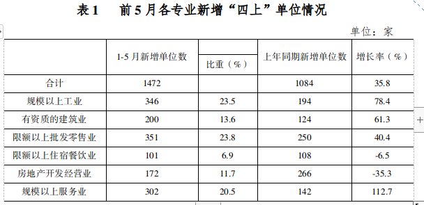 前5月,全省新增“四上”单位1472家,较上年同期多增388家,增长35.8%。