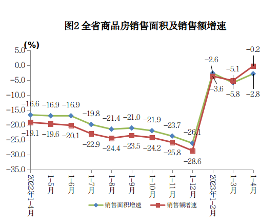 1-4月,随着经济恢复向好、稳定房地产市场政策显现以及市场预期好转,全省商品房销售面积跌幅收窄,房地产市场逐步企稳。
