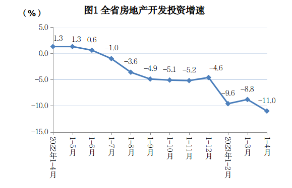 1-4月,全省商品房施工面积30021.40万平方米,同比下降12.9%,其中住宅施工面积22840.87万平方米,下降11.1%。房屋新开工面积1305.39万平方米,下降14.0%,其中住宅新开工面积1028.40万平方米,下降14.4%。房屋竣工面积1117.85万平方米,增长4.2%,其中住宅竣工面积861.84万平方米,增长4.8%。