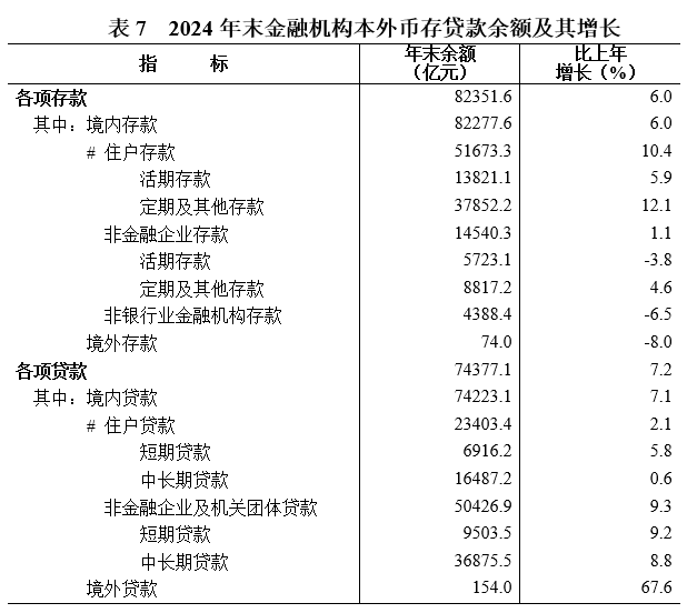 年末金融机构本外币各项存款余额82351.6亿元,比上年末增长6.0%。其中,住户存款余额51673.3亿元,增长10.4%;非金融企业存款余额14540.3亿元,增长1.1%。本外币各项贷款余额74377.1亿元,增长7.2%。其中,住户贷款余额23403.4亿元,增长2.1%;非金融企业及机关团体贷款余额50426.9亿元,增长9.3%。
