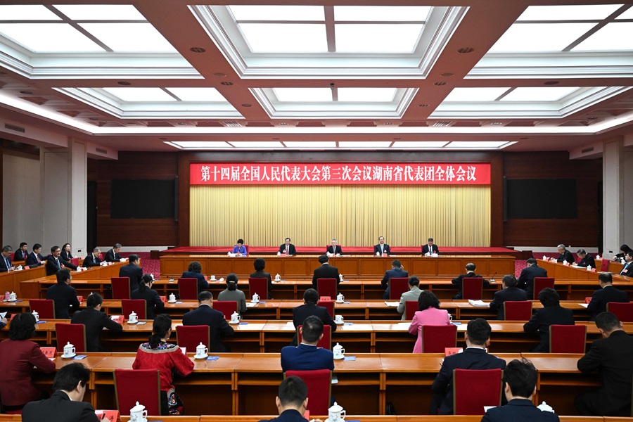 3月11日,出席十四届全国人大三次会议的湖南代表团在驻地举行分组会议,审议关于全国人大常委会工作报告、最高人民法院工作报告、最高人民检察院工作报告的决议草案;并举行第五次全体会议,总结湖南代表团前段工作,对传达学习贯彻大会精神作初步安排。代表团团长沈晓明主持会议并讲话。副团长毛伟明、王双全,以及杜家毫、胡旭晟、杨维刚、蒋涤非、周海兵、朱玉、叶晓颖、李建成等出席会议。