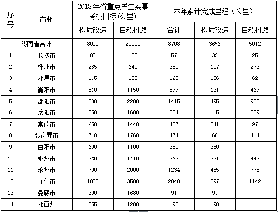 截至7月底,各市州基本完成自然村通水泥(沥青)路建设招标工作,签订了框架协议,全年累计开工7260公里,完成路面5012公里。全年累计开工提质改造农村公路6022公里,完成提质改造农村公路3696公里。各市州完成情况见下表: