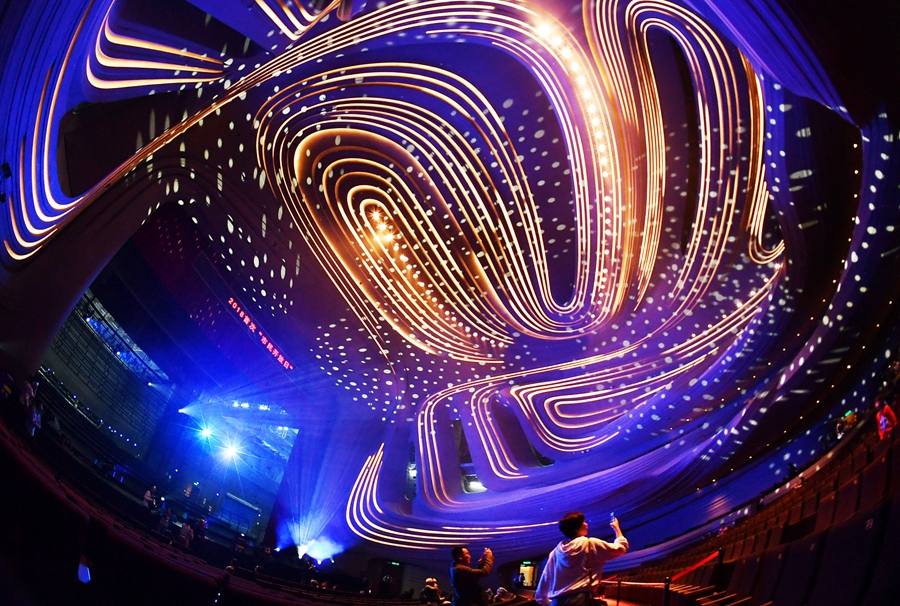 4月29日上午,长沙梅溪湖国际文化艺术中心大剧院,市民欣赏舞台灯光秀。当天,该剧院“五月春来·共赏芙蓉”市民开放日活动启动,邀请市民走进剧院,感受“芙蓉国里芙蓉花开”的艺术文化。