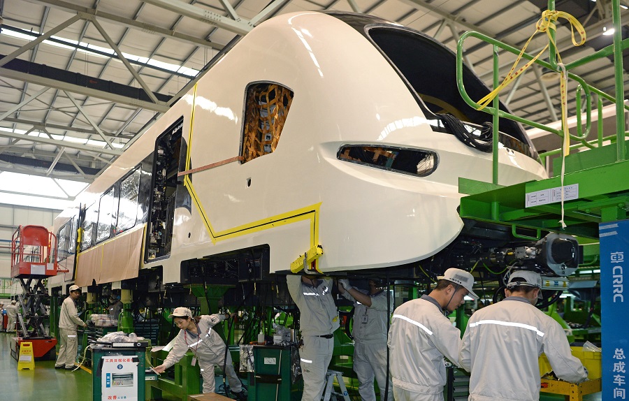 5月2日,中车株洲电力机车有限公司,工作人员在装配“2.0”版快速磁浮列车。“2.0”版快速磁浮列车时速从每小时100公里提高到160公里,载客量提升超过30%。该列车预计6月下线。 见习记者 傅聪 摄