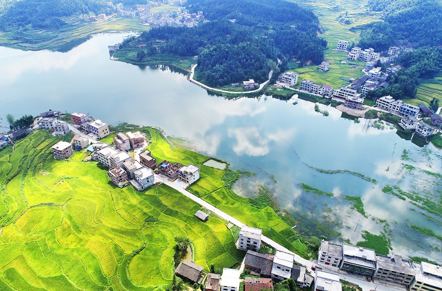 8月28日,新邵县龙溪铺镇卓笔村,碧绿的库水、葱郁的植被、金黄的田野构成了一幅秀美的生态画卷。