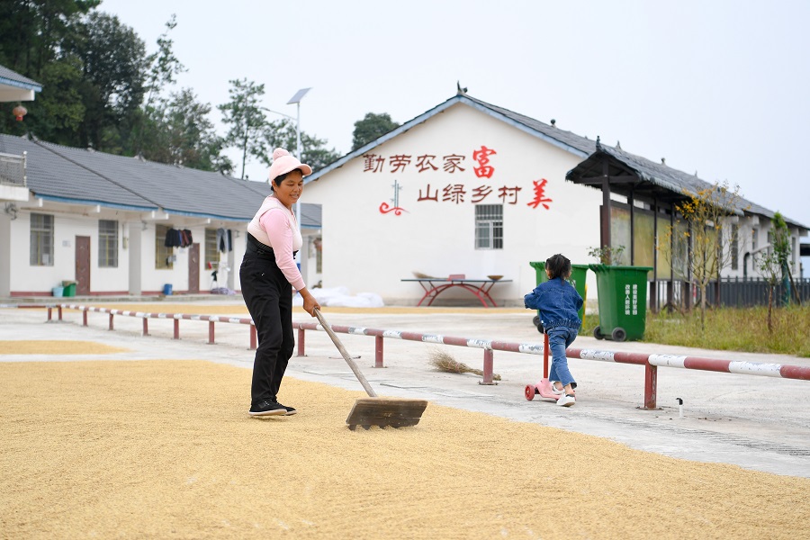 10月13日,桑植县洪家关白族乡花园村易地扶贫搬迁安置点,贫困户陈银芝在家门口的广场上晾晒稻谷。